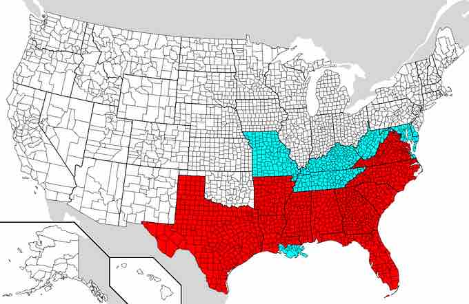 Areas covered by the Emancipation Proclamation are shown in red. Slaveholding areas not covered are shown in blue.