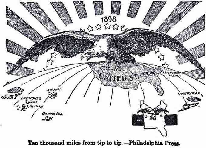 "Ten Thousand Miles from Tip to Tip," refers to the extension of U.S. domination (symbolized by a bald eagle) from Puerto Rico to the Philippines. The cartoon contrasts the 1898 representation with that of the United States in 1798.