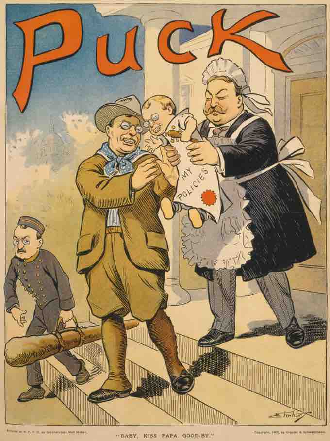 This political cartoon satirizes the expectation that Roosevelt would hand his policies over to the incoming president, William Howard Taft, his handpicked successor.