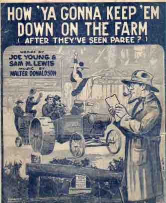 A popular Tin Pan Alley song of 1919 asked a question with unintended economic ramifications about United States troops returning from World War I: "How Ya Gonna Keep 'Em Down On the Farm After They've Seen Paree?" In fact, many did not remain down on the farm and instead became part of a great migration of youth from farms to nearby towns and smaller cities. Some of this could be attributed to a desire for something more adventurous than rural life after seeing some of the culture capitals of Europe, but the migration was also driven by factors such as farm mechanization.