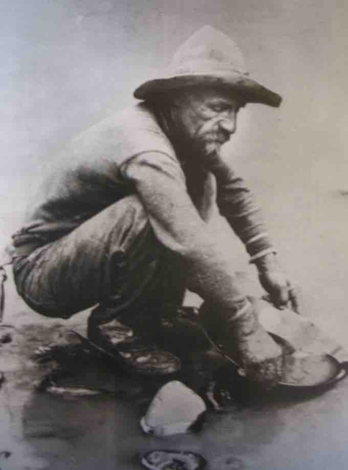 A forty-niner, so called because he came to California in 1849, pans for gold.