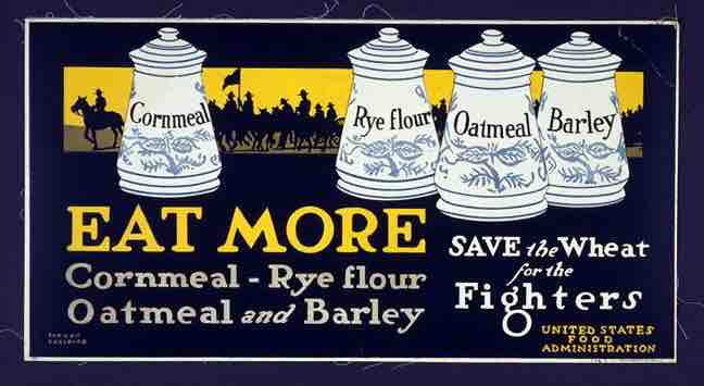 The United States Food Administration urges Americans to eat non-traditional grains, saving wheat for fighting soldiers.