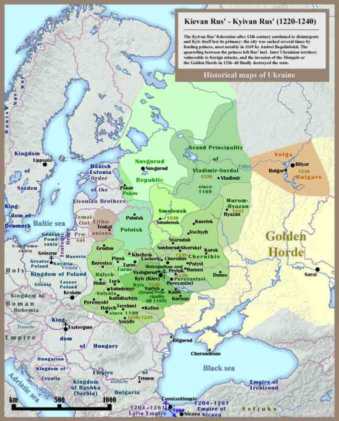 This map illustrates the power dynamics at play during the 13th century shortly before Ivan I was born. Sarai, the capital of the Golden Horde, sat to the southeast, while Moscow (not visible on this map) was tucked up in the northern forests of Vladimir-Suzdal.