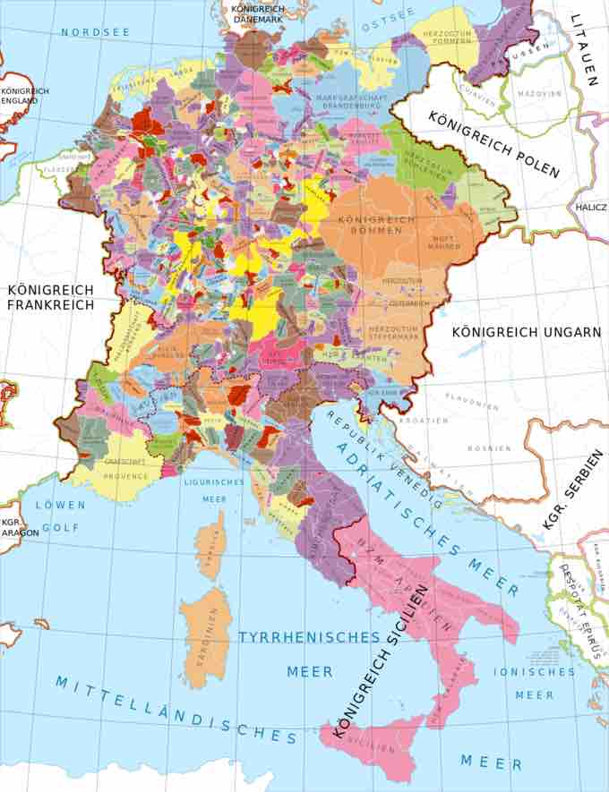 The Hohenstaufen-ruled Holy Roman Empire and Kingdom of Sicily. Imperial and directly held Hohenstaufen land in the empire is shown in bright yellow. This map shows the patchwork of relatively autonomous principalities that made up the Holy Roman Empire.