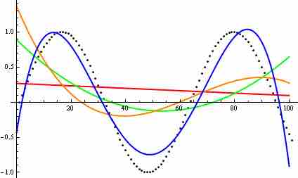 Polynomial curves generated to fit points (black dots) of a sine function: The red line is a first degree polynomial; the green is a second degree; the orange is a third degree; and the blue is a fourth degree.