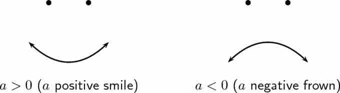 In graphs of quadratic functions, the sign on the coefficient $a$ affects whether the graph opens up or down. If $a<0$, the graph makes a frown (opens down) and if $a>0$ then the graph makes a smile (opens up). This is shown below.