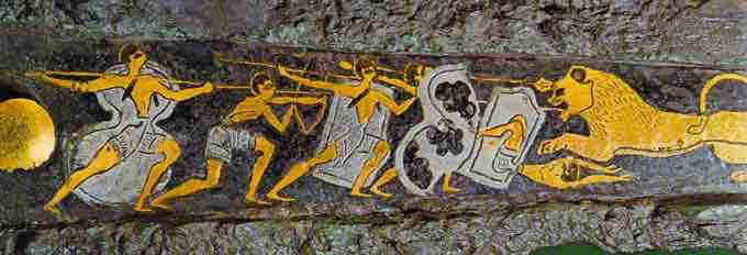 Mycenaean hunting dagger with scene of a lion hunt. Bronze with gold, silver, and niello inlay. c. 16th century BCE. Grave Circle A, Mycenae, Greece.