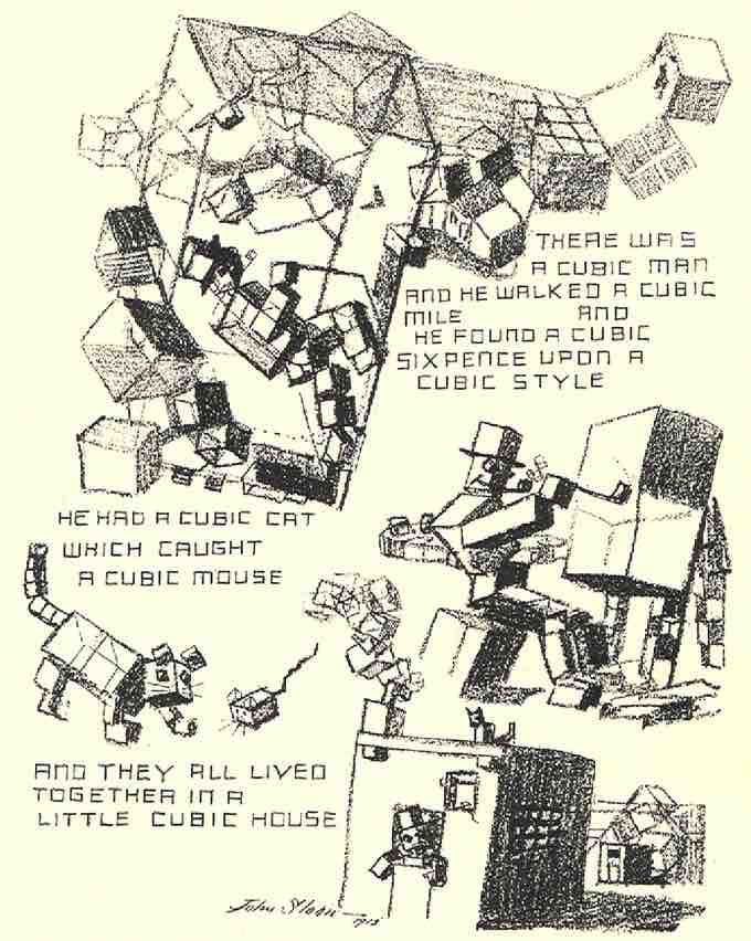 "A Slight Attack of Third Dimentia Brought on by Excessive Study of the Much Talked of Cubist Pictures in the International Exhibition at New York," drawn by John French Sloan in April 1913. Published before 1923.