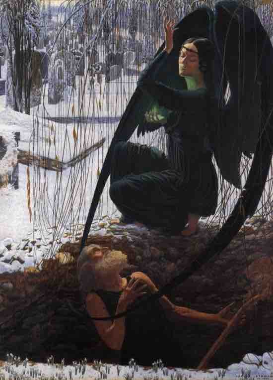 La mort du fossoyeur ("The death of the gravedigger") by Carlos Schwabe is a visual compendium of symbolist motifs. Death and angels, pristine snow, and the dramatic poses of the characters all express symbolist longings for transfiguration "anywhere, out of the world. "