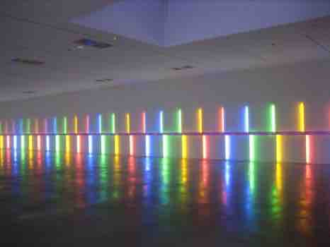 This site-specific installation by Dan Flavin is uses different colored lights to illuminate this interior gallery space.