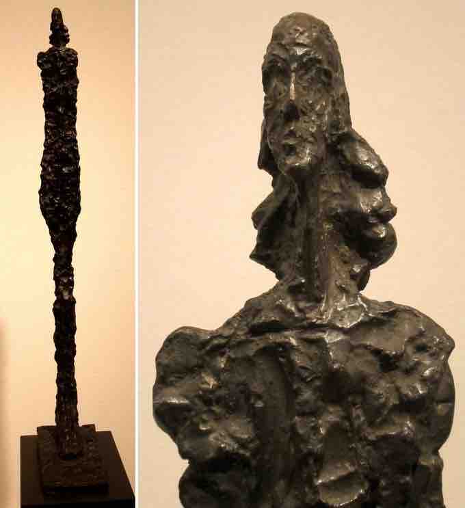 Giacometti's "Woman of Venice" presents the typical solitary figure often seen in his work which was heavily influenced by existentialist modes of thought.
