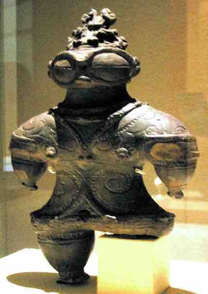 Representative forms such as clay figurines of people and animals also appeared around this time. These figurines, called dogū, are often described as "goggle-eyed" and feature elaborate geometrical designs and short, stubby limbs. They are generally believed to have borne a religious or ritual significance.
