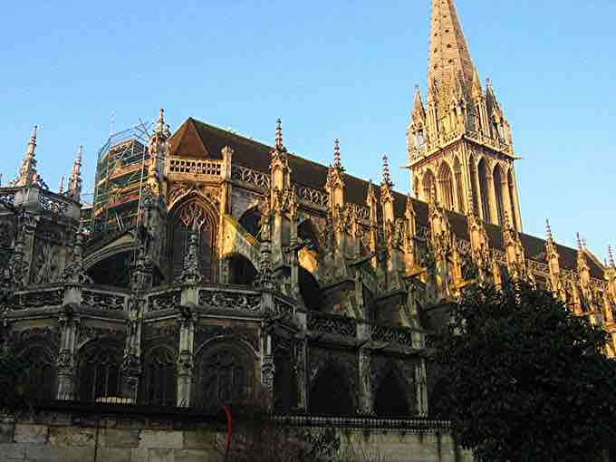 The Church of Saint-Pierre is another prime example of Norman architecture. It is a Roman Catholic church dedicated to Saint Peter; it is situated on the Place Saint Pierre in the center of Caen in Normandy. The construction of the present building took place between the early 13th and the 16th centuries. The spire was destroyed in 1944 and has since been rebuilt. The eastern apse of the church was built by Hector Sohier between 1518 and 1545. The interior choir and the exterior apse display an architecture that embodies the transition from Gothic to Renaissance. Around its top run balustrades formed of Gothic letters, which read as part of the Magnificat. Its west portal, the decoration of the spire of the tower, and its stained glass are among the features which make it one of the finest churches of the Rouen diocese.
