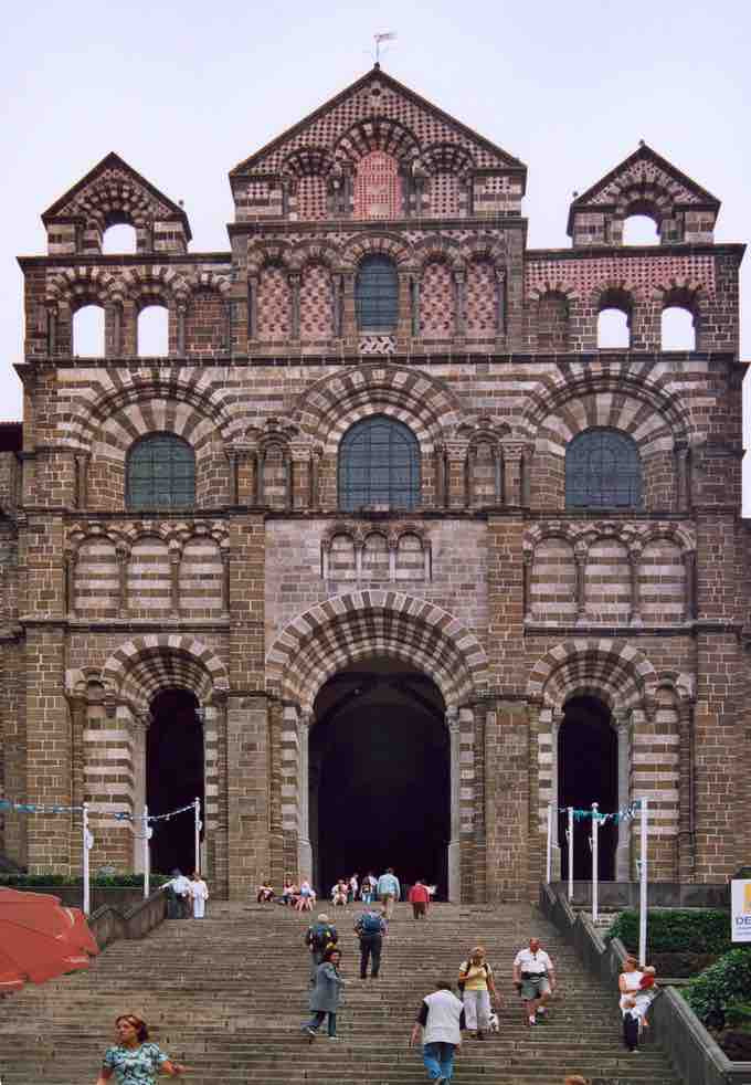 The facade of Notre Dame du Puy, le Puy en Velay, France, has a more complex arrangement of diversified arches: doors of varying widths, blind arcading, windows, and open arcades.