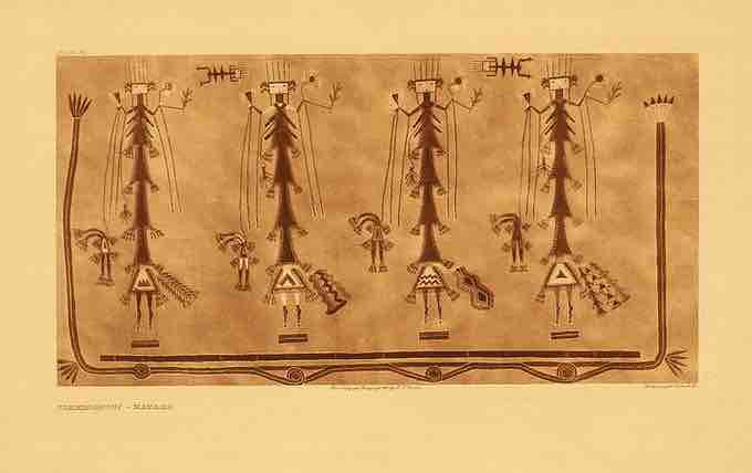 One of the four elaborate dry-paintings or sand altars employed in the rites of the Mountain Chant, a Navaho medicine ceremony of nine days' duration.
