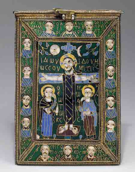 Reliquaries take many forms and shapes and are made out of a variety of materials. However, many reliquaries were made from or decorated with expensive material, such as gold and precious stones. A reliquary from the early ninth century depicts a scene of the Crucifixion with fourteen saints around the border. The reliquary is very small and probably contained a piece of the True Cross, the cross on which Christ was crucified. This reliquary is made from cloisonné, a metalworking technique in which metal was soldered into compartments and was then filled with enamel, glass, gems, or other materials. This reliquary is made with green, white, blue, and red enamel and gold and is only four inches high by nearly three inches wide.
