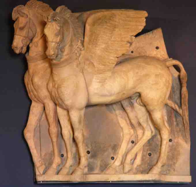 A pair of winged horses from the Altar of the Queen, an Etruscan sanctuary located in Tarquinia, are examples of Etruscan skill and modeling with terra cotta. The horses are muscular, with strong chests, fine legs, and elongated bodies. They appear to prance as they wait to pull a chariot. Their necks arch, with manes blowing in the wind, and their heads are drawn in, as if pulled back by a pair of unseen reins.