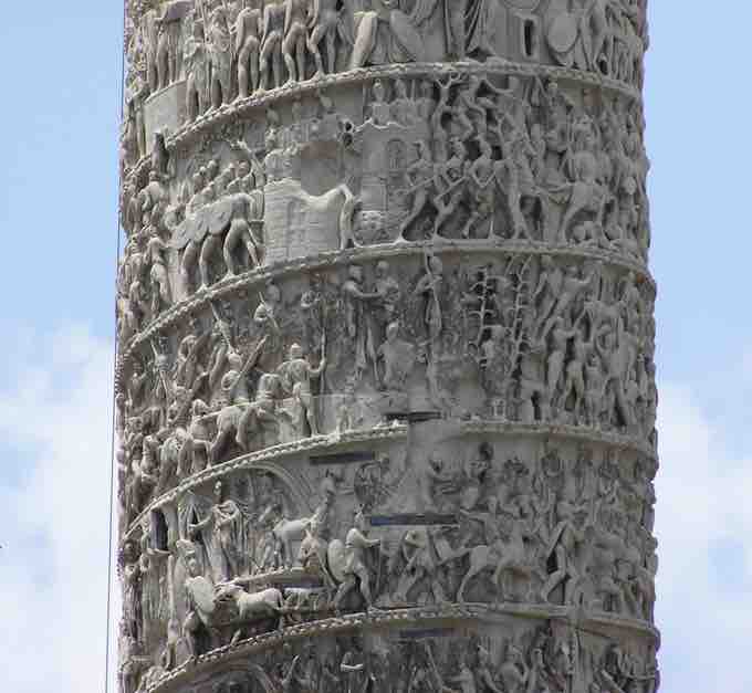 A victory column was also erected for Marcus Aurelius . This is modeled on Trajan's column and was originally erected on the Campus Martius between the Temple of Divine Hadrian and the Temple of Divine Marcus Aurelius. A relief frieze encircles the column and depicts his military campaigns at the end of his life in Germania.