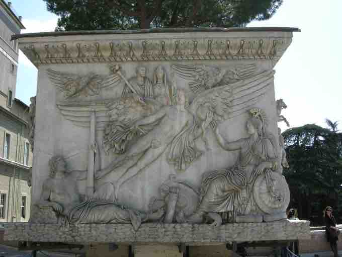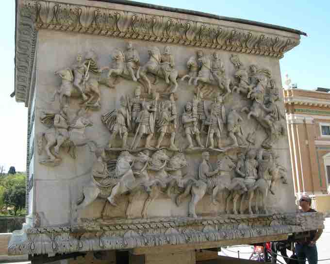 Antoninus Pius' heirs, Lucius Verus and Marcus Aurelius, had a column erected to him on the Campus Martius, the base of which survives today. On two of its sides is an identical scene of a military decursio (), depicting cavalry men parading around soldiers, two of whom hold standards. The relief carvings are noticeably deep; the figures protrude from the sides and are visible when viewing the non-decursio side of the pedestal. All naturalism has been removed from the scene. It depicts each figure from a ground-level perspective while showing the circular parade from a bird's eye view.