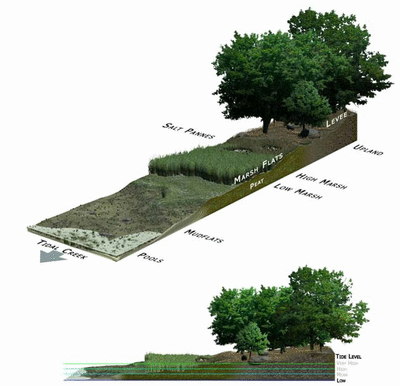 Coastal salt marshes can be distinguished from terrestrial habitats by the daily tidal flow that occurs and continuously floods the area. It is an important process in delivering sediments, nutrients and plant water supply to the marsh. At higher elevations in the upper marsh zone, there is much less tidal inflow, resulting in lower salinity levels. Soil salinity in the lower marsh zone is fairly constant due to everyday annual tidal flow. However, in the upper marsh, variability in salinity is shown as a result of less frequent flooding and climate variations. Rainfall can reduce salinity and evapotranspiration can increase levels during dry periods. As a result, there are microhabitats populated by different species of flora and fauna dependant on their physiological abilities.