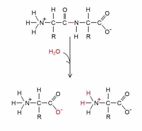 In the hydrolysis reaction shown here, the dipeptide is broken down to form two ionized amino acids with the addition of a water molecule. One amino acid gets an oxygen atom and a negative charge, the other amino acid gets two hydrogen atoms and a positive charge. This is the reverse of the dehydration synthesis reaction joining these two monomers.