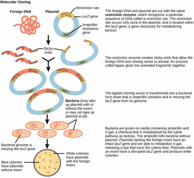 Plasmids occur naturally in bacterial populations (such as Escherichia coli) and have genes that can contribute favorable traits to the organism such as antibiotic resistance (the ability to be unaffected by antibiotics). Plasmids have been repurposed and engineered as vectors for molecular cloning and the large-scale production of important reagents such as insulin and human growth hormone. An important feature of plasmid vectors is the ease with which a foreign DNA fragment can be introduced via the multiple cloning site (MCS). The MCS is a short DNA sequence containing multiple sites that can be cut with different commonly-available restriction endonucleases. Restriction endonucleases recognize specific DNA sequences and cut them in a predictable manner; they are naturally produced by bacteria as a defense mechanism against foreign DNA. Many restriction endonucleases make staggered cuts in the two strands of DNA, such that the cut ends have a 2- or 4-base single-stranded overhang. Because these overhangs are capable of annealing with complementary overhangs, these are called "sticky ends." Addition of an enzyme called DNA ligase permanently joins the DNA fragments via phosphodiester bonds. In this way, any DNA fragment generated by restriction endonuclease cleavage can be spliced between the two ends of a plasmid DNA that has been cut with the same restriction endonuclease .
