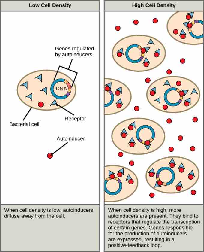 Signaling in bacteria, known as quorum sensing, enables bacteria to monitor extracellular conditions, ensure sufficient amounts of nutrients are present, and avoid hazardous situations. There are circumstances, however, when bacteria communicate with each other.