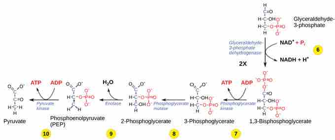 The second half of glycolysis involves phosphorylation without ATP investment (step 6) and produces two NADH and four ATP molecules per glucose.