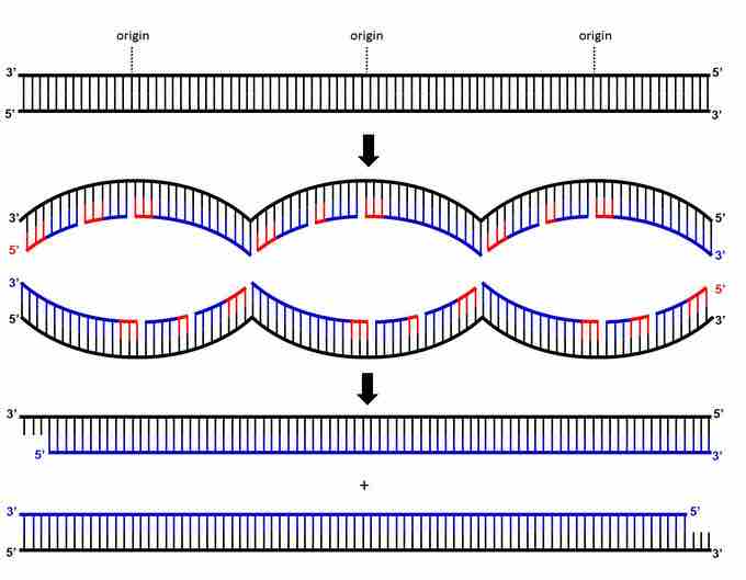 A simplified schematic of DNA replication where the parental DNA (top) is replicated from three origins of replication, yielding three replication bubbles (middle) before giving rise to two daughter DNAs (bottom). Parental DNA strands are black, newly synthesized DNA strands are blue, and RNA primers are red. All RNA primers will be removed by Rnase H and FEN1, leaving gaps in the newly-synthesized DNA strands (not shown.) DNA Polymerase and Ligase will replace all the RNA primers with DNA except the RNA primer at the 5' ends of each newly-synthesized (blue) strand. This means that each newly-synthesized DNA strand is shorter at its 5' end than the equivalent strand in the parental DNA.