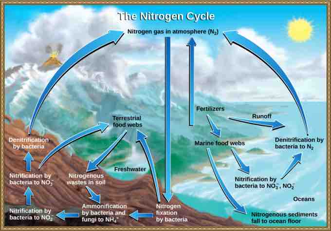 Nitrogen enters the living world from the atmosphere via nitrogen-fixing bacteria. This nitrogen and nitrogenous waste from animals is then processed back into gaseous nitrogen by soil bacteria, which also supply terrestrial food webs with the organic nitrogen they need.