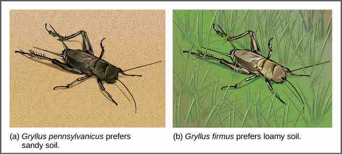 Speciation can occur when two populations occupy different habitats. The habitats need not be far apart. The cricket (a) Gryllus pennsylvanicus prefers sandy soil, while the cricket (b) Gryllus firmus prefers loamy soil. The two species can live in close proximity, but because of their different soil preferences, they became genetically isolated.