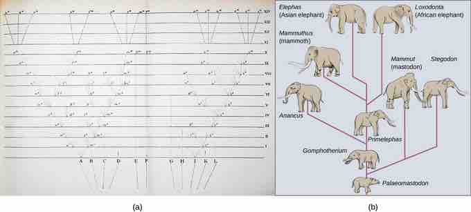 The only illustration in Darwin's On the Origin of Species is (a) a diagram showing speciation events leading to biological diversity. The diagram shows similarities to phylogenetic charts that are drawn today to illustrate the relationships of species. (b) Modern elephants evolved from the Palaeomastodon, a species that lived in Egypt 35–50 million years ago.