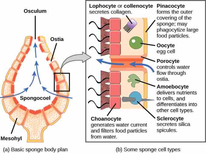 The sponge's (a) basic body plan is a cylinder shape with a large central cavity. The specialized cell types in sponges (b) each perform a distinct function.