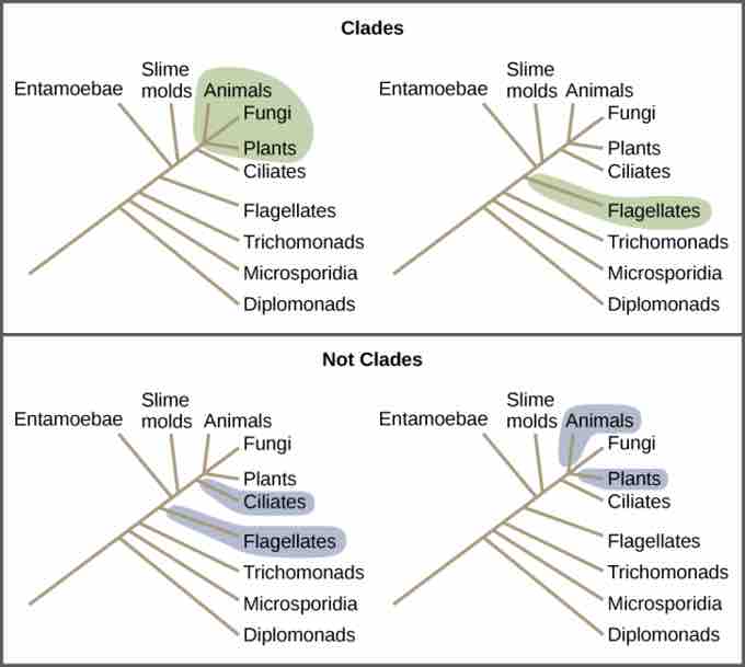All the organisms within a clade stem from a single point on the tree. A clade may contain multiple groups, as in the case of animals, fungi, and plants, or a single group, as in the case of flagellates. Groups that diverge at a different branch point, or that do not include all groups in a single branch point, are not considered clades.