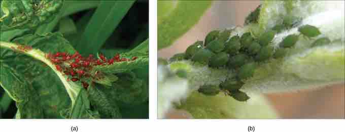 (a) Red aphids get their color from red carotenoid pigment. Genes necessary to make this pigment are present in certain fungi. Scientists speculate that aphids acquired these genes through HGT after consuming fungi for food. If genes for making carotenoids are inactivated by mutation, the aphids revert back to (b) their green color. Red coloration makes the aphids much more conspicuous to predators, but evidence suggests that red aphids are more resistant to insecticides than green ones. Thus, red aphids may be more fit to survive in some environments than green ones.