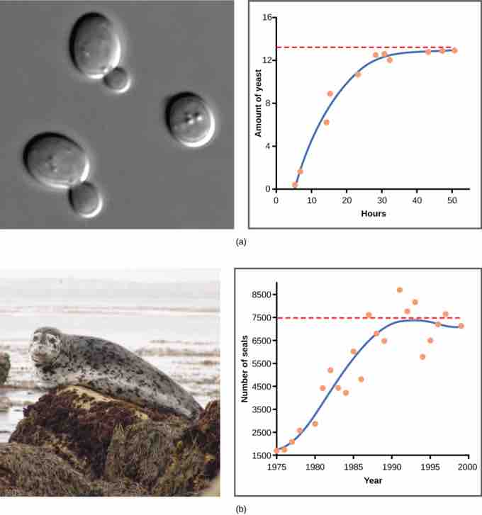 Yeast, a microscopic fungus used to make bread and alcoholic beverages, exhibits the classical S-shaped curve when grown in a test tube ( a). Its growth levels off as the population depletes the nutrients that are necessary for its growth. In the real world, however, there are variations to this idealized curve. Examples in wild populations include sheep and harbor seals ( b). In both examples, the population size exceeds the carrying capacity for short periods of time and then falls below the carrying capacity afterwards. This fluctuation in population size continues to occur as the population oscillates around its carrying capacity. Still, even with this oscillation, the logistic model is confirmed.