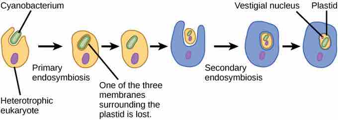 The hypothesized process of endosymbiotic events leading to the evolution of chlorarachniophytes is shown. In a primary endosymbiotic event, a heterotrophic eukaryote consumed a cyanobacterium. In a secondary endosymbiotic event, the cell resulting from primary endosymbiosis was consumed by a second cell. The resulting organelle became a plastid in modern chlorarachniophytes.