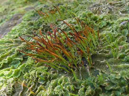 Unlike liverworts, hornworts grow a tall and slender sporophyte.