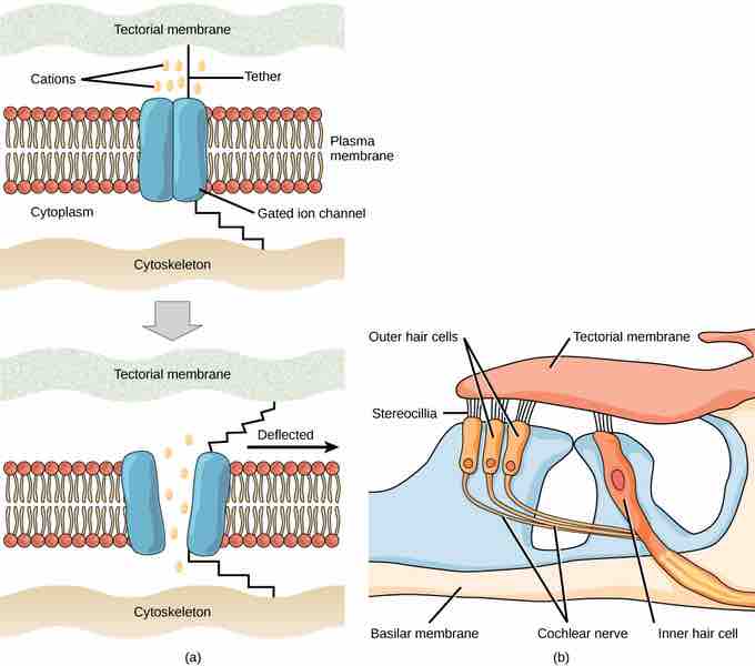 (a) Mechanosensitive ion channels are gated ion channels that respond to mechanical deformation of the plasma membrane. A mechanosensitive channel is connected to the plasma membrane and the cytoskeleton by hair-like tethers. When pressure causes the extracellular matrix to move, the channel opens, allowing ions to enter or exit the cell. (b) Stereocilia in the human ear are connected to mechanosensitive ion channels. When a sound causes the stereocilia to move, mechanosensitive ion channels transduce the signal to the cochlear nerve.