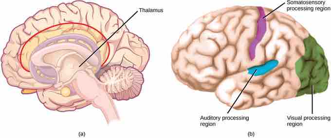 The brain has dedicated areas to the processing of stimuli, including: (a) thalamus and (b) the auditory, visual and somatosensory processing regions.