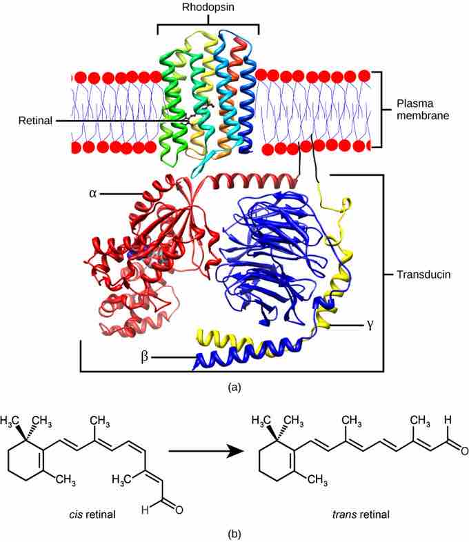 (a) Rhodopsin, the photoreceptor in vertebrates, has two parts: the trans-membrane protein opsin and retinal. When light strikes the retinal, it changes shape from (b) a cis to a trans form. The signal is passed to a G-protein called transducin, triggering a series of downstream events.