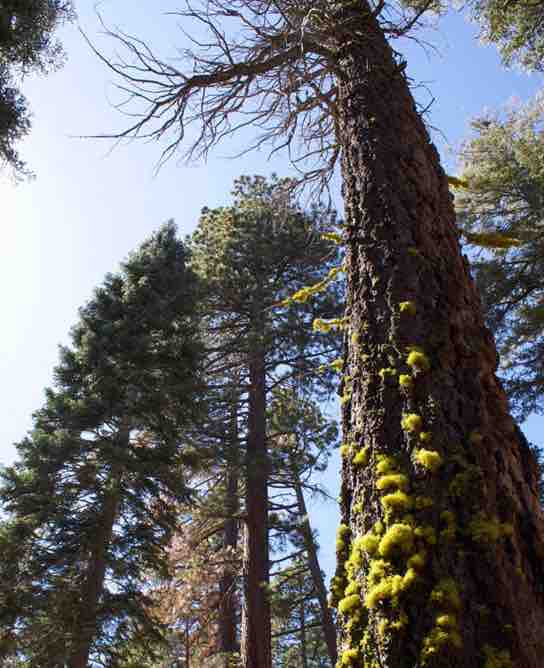 Lichens, which result from the symbiotic relationship between fungi and green algae, are often seen growing on trees.