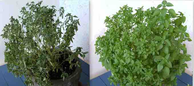 Without adequate water, the plant on the left has lost turgor pressure, visible in its wilting; the turgor pressure is restored by watering it (right).