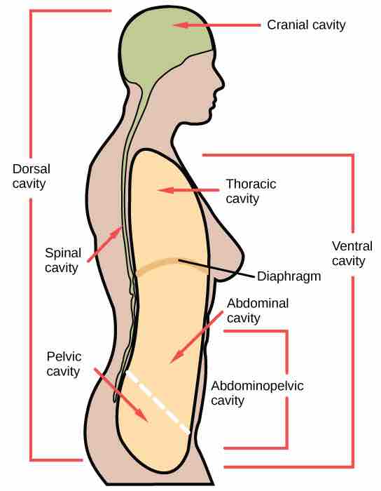 Vertebrate animals have two major body cavities. The dorsal cavity, indicated in green, contains the cranial and the spinal cavity. The ventral cavity, indicated in yellow, contains the thoracic cavity and the abdominopelvic cavity. The thoracic cavity is separated from the abdominopelvic cavity by the diaphragm. The abdominopelvic cavity is separated into the abdominal cavity and the pelvic cavity by an imaginary line parallel to the pelvis bones.