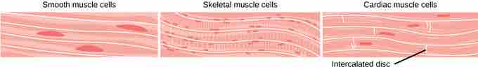 There are three types of muscle in animal bodies: smooth, skeletal, and cardiac. They differ by the presence or absence of striations or bands, the number and location of nuclei, whether they are voluntarily or involuntarily controlled, and their location within the body.