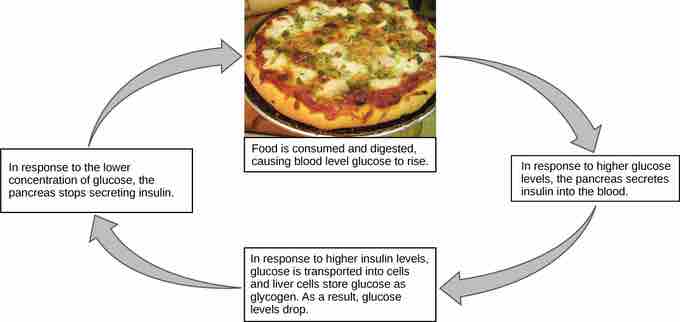 Any homeostatic process that changes the direction of the stimulus is a negative feedback loop. It may either increase or decrease the stimulus, but the stimulus is not allowed to continue as it did before the receptor sensed it. In other words, if a level is too high, the body does something to bring it down; conversely, if a level is too low, the body does something to raise it; hence, the term: negative feedback. An example of negative feedback is the maintenance of blood glucose levels. When an animal has eaten, blood glucose levels rise, which is sensed by the nervous system. Specialized cells in the pancreas (part of the endocrine system) sense the increase, releasing the hormone insulin. Insulin causes blood glucose levels to decrease, as would be expected in a negative feedback system . However, if an animal has not eaten and blood glucose levels decrease, this is sensed in a different group of cells in the pancreas: the hormone glucagon is released, causing glucose levels to increase. This is still a negative feedback loop, but not in the direction expected by the use of the term "negative." Another example of an increase as a result of a feedback loop is the control of blood calcium. If calcium levels decrease, specialized cells in the parathyroid gland sense this and release parathyroid hormone (PTH), causing an increased absorption of calcium through the intestines and kidneys. The effects of PTH are to raise blood levels of calcium. Negative feedback loops are the predominant mechanism used in homeostasis.