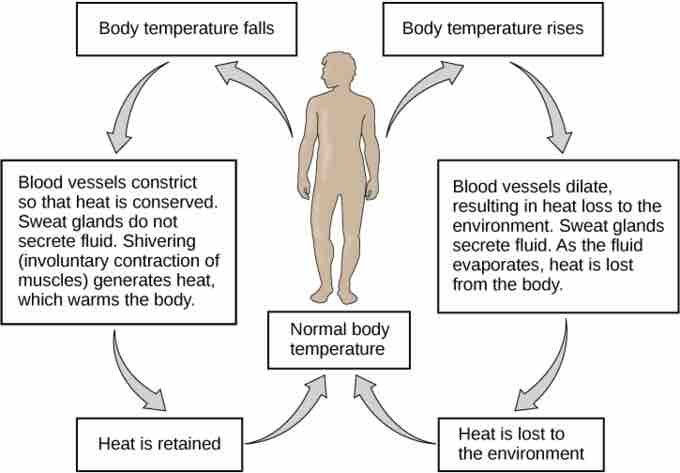 Endotherms use their circulatory systems to help maintain body temperature. For example, vasodilation brings more blood and heat to the body surface, facilitating radiation and evaporative heat loss, which helps to cool the body. However, vasoconstriction reduces blood flow in peripheral blood vessels, forcing blood toward the core and the vital organs found there, conserving heat . Some animals have adaptions to their circulatory system that enable them to transfer heat from arteries to veins, thus, warming blood that returns to the heart. This is called a countercurrent heat exchange; it prevents the cold venous blood from cooling the heart and other internal organs. This adaption, which can be shut down in some animals to prevent overheating the internal organs, is found in many animals, including dolphins, sharks, bony fish, bees, and hummingbirds. In contrast, similar adaptations (as in dolphin flukes and elephant ears) can help cool endotherms when needed.