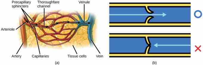 (a) Precapillary sphincters are rings of smooth muscle that regulate the flow of blood through capillaries; they help control the blood flow to where it is needed. (b) Valves in the veins prevent blood from moving backward.