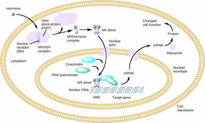 An intracellular nuclear receptor (NR) is located in the cytoplasm bound to a heat shock protein (HSP). Upon hormone binding, the receptor dissociates from the heat shock protein and translocates to the nucleus. In the nucleus, the hormone-receptor complex binds to a DNA sequence called a hormone response element (HRE), which triggers gene transcription and translation. The corresponding protein product can then mediate changes in cell function.