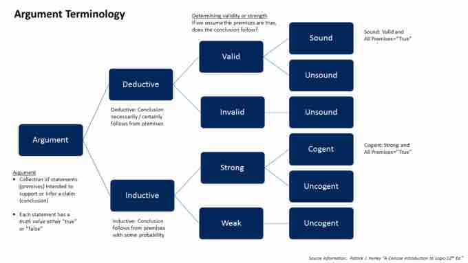 This image outlines the anatomy of an argument. Valid premises lead to sound or cogent conclusions, while invalid premises result in unsound or uncogent conclusions.